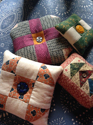 I also made a few pin cushions. :) I did not make the pretty one with the tiny flying geese. That one was a gift from a dear friend several years ago. I use it all the time. I actually made 4 but didn't get a pic of the other one. These were all made from leftover blocks or small orphan blocks. I filled them with crushed walnut shells. I like the weight that it gives to them.
